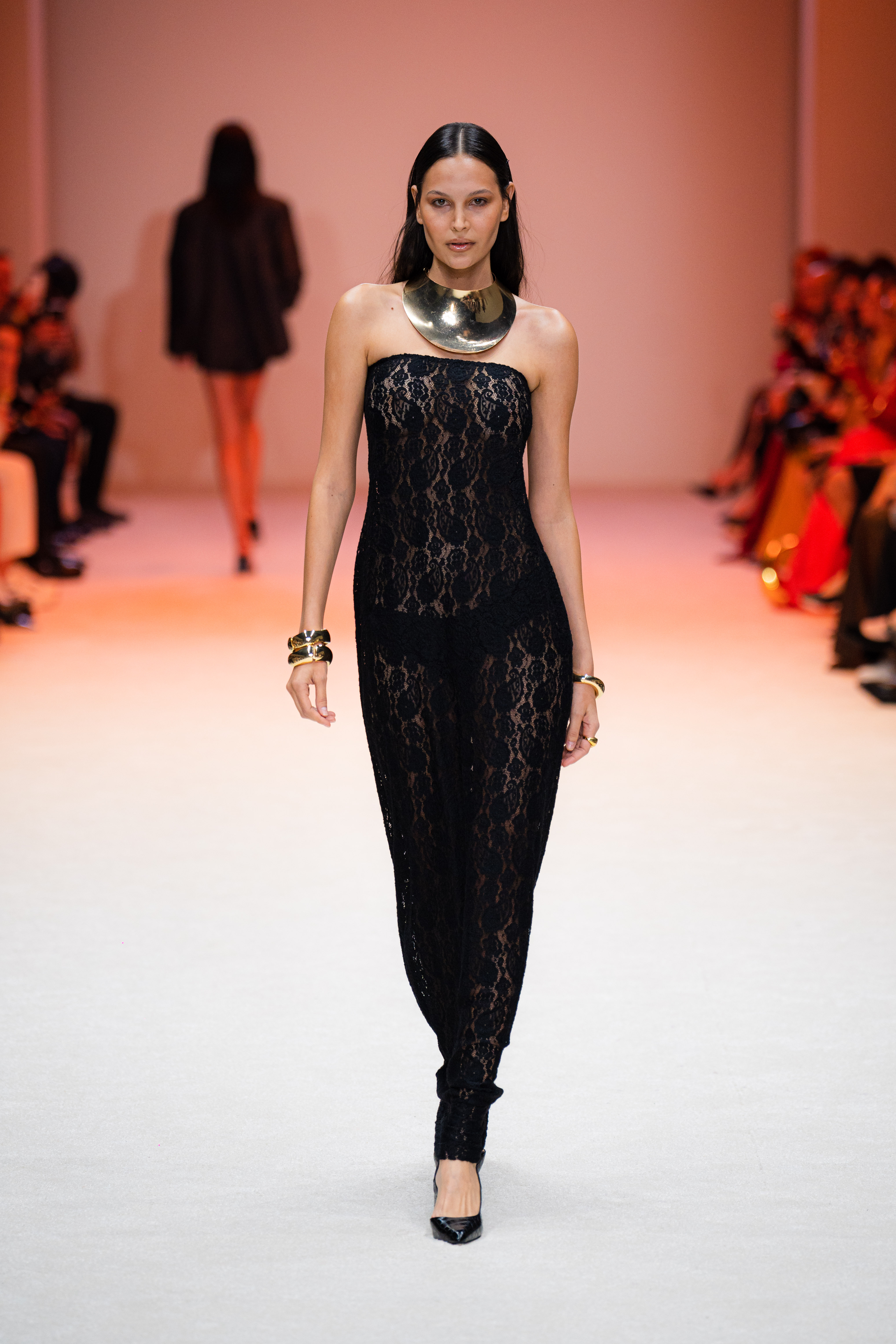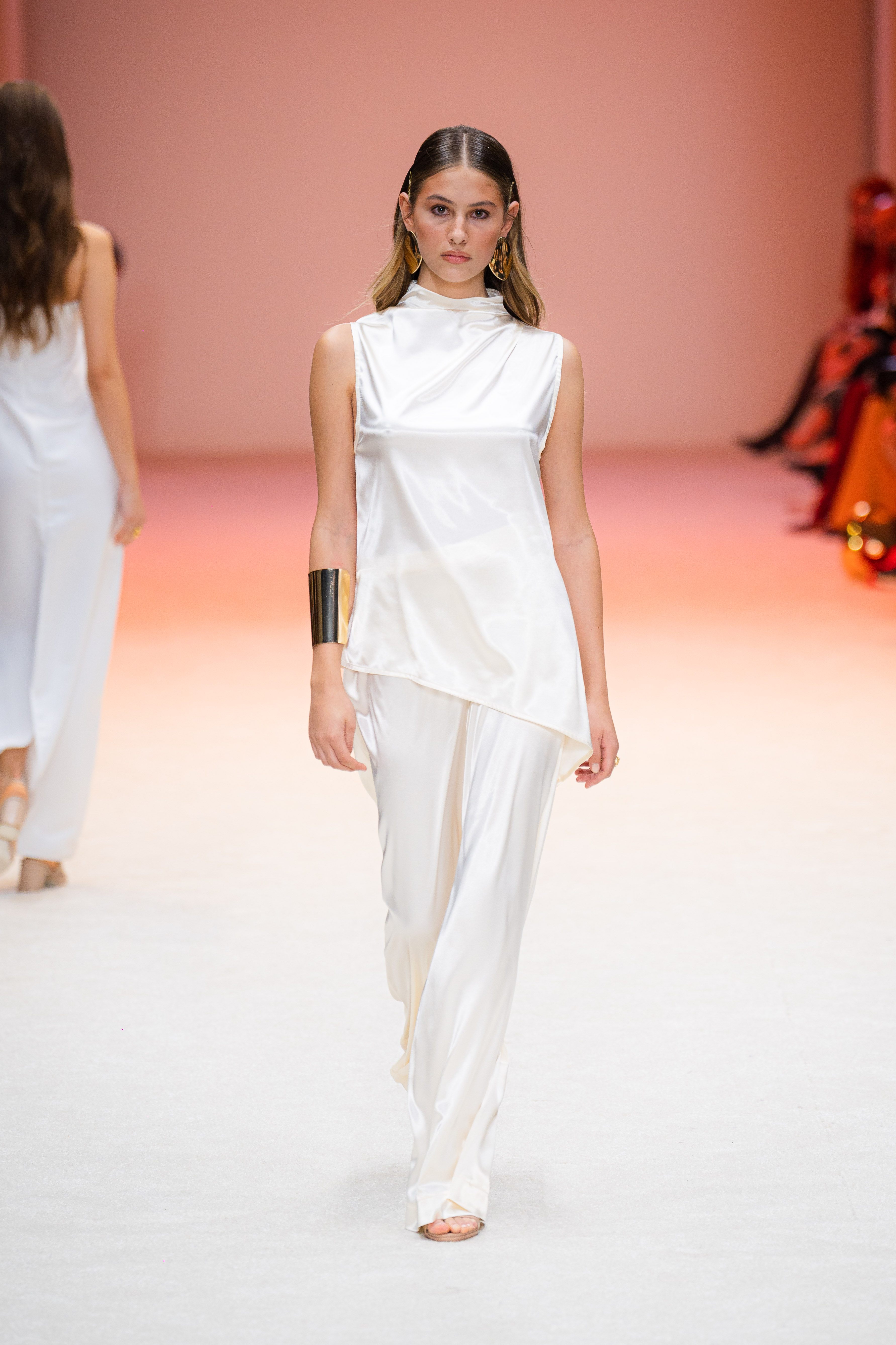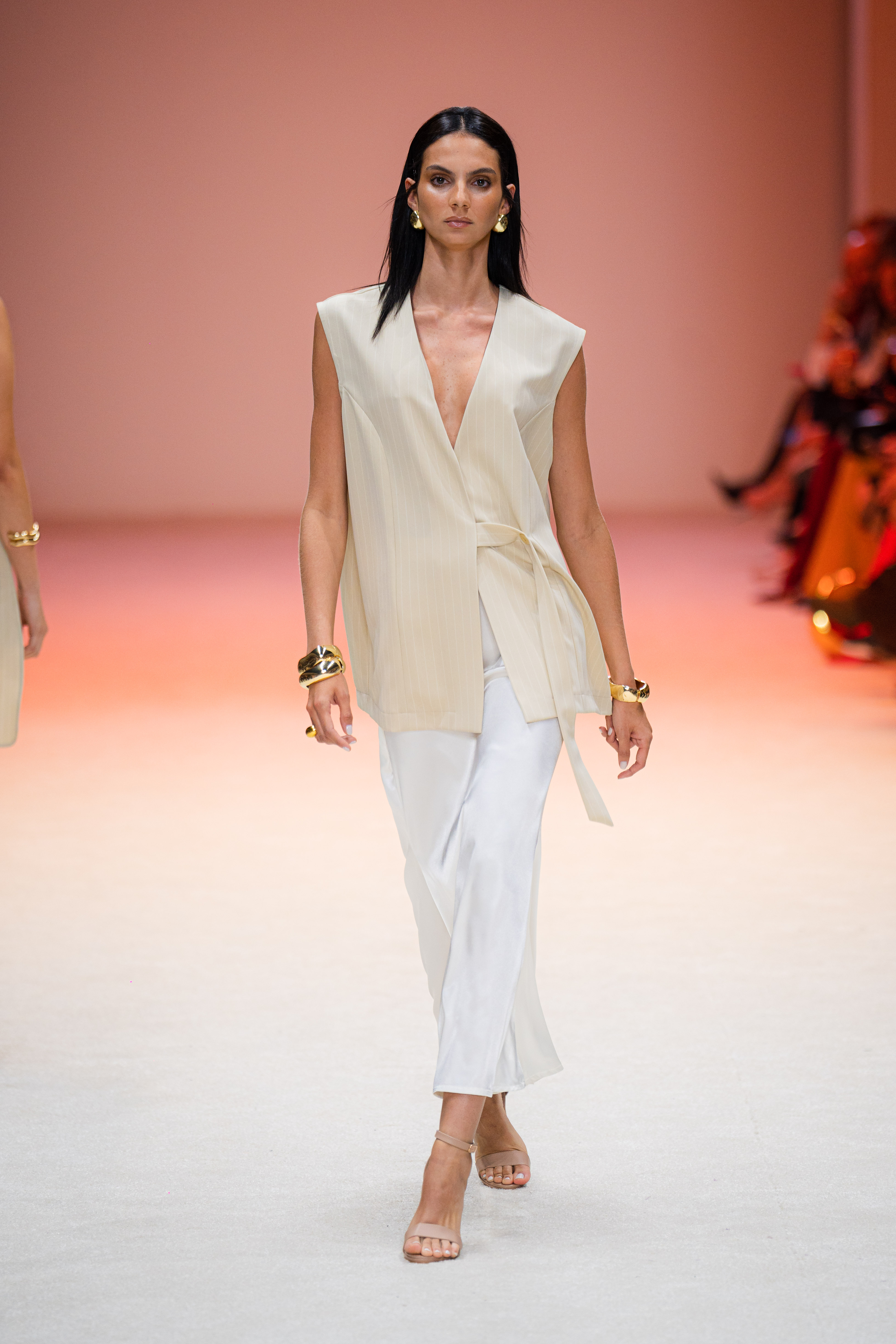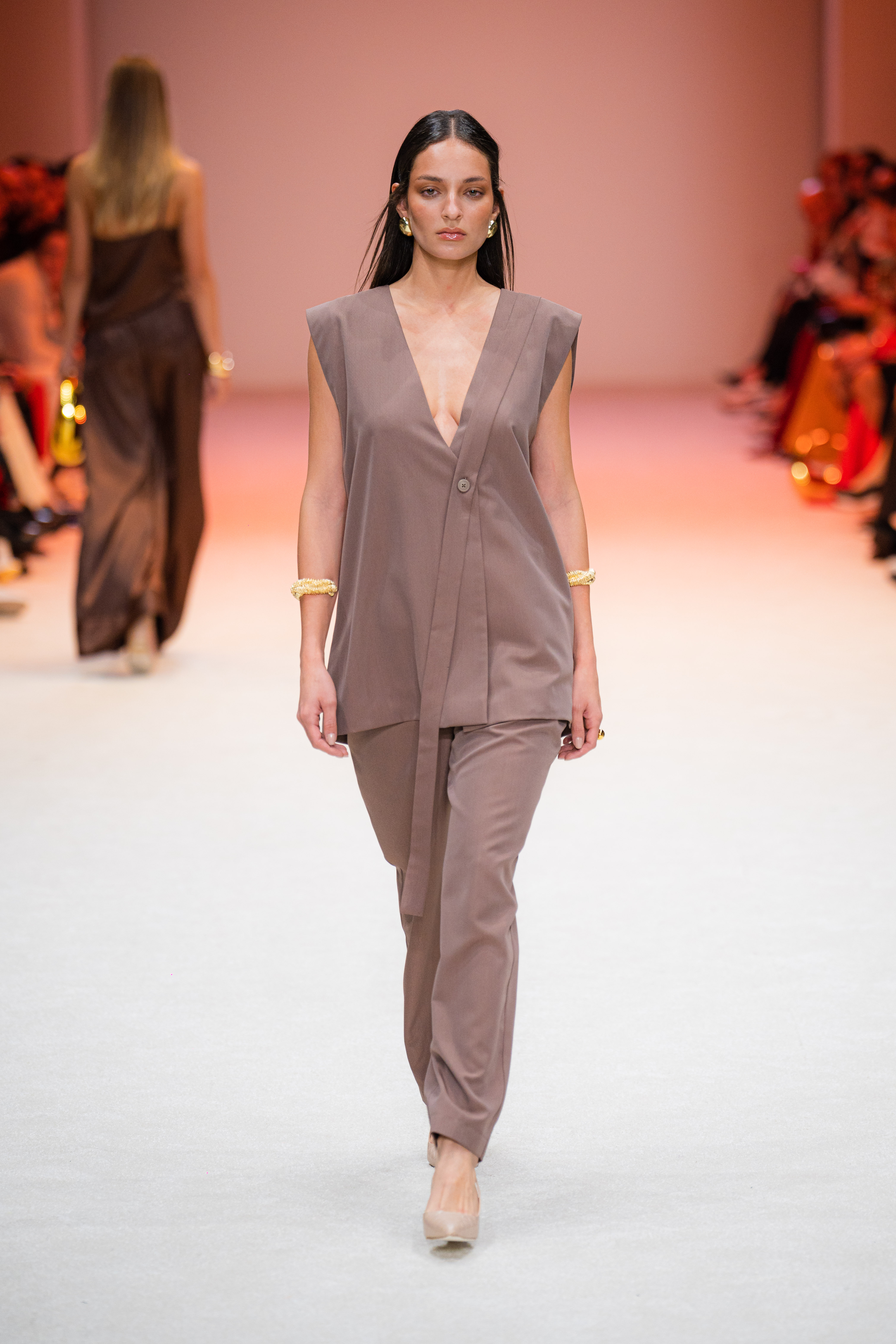 La ambientación de la pasarela fue fundamental para crear la atmósfera adecuada. Desde el inicio, un juego de luces blancas y constantes envolvió el espacio, proporcionando un fondo elegante que resaltó cada uno de los diseños expuestos. La música, de ritmo lento y envolvente, se acopló perfectamente al paso de los modelos, creando una experiencia sensorial que mantuvo a la audiencia en un estado de admiración.