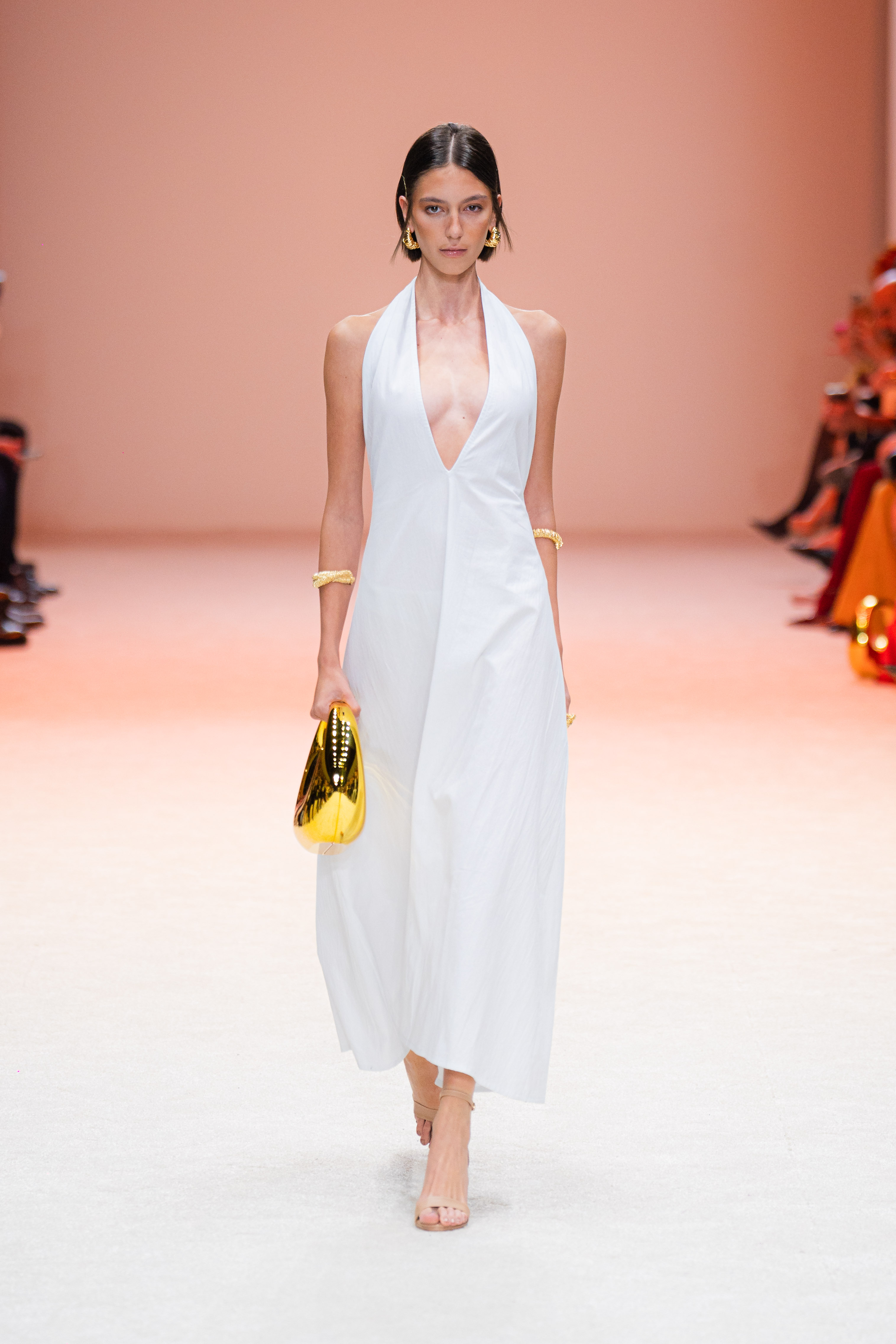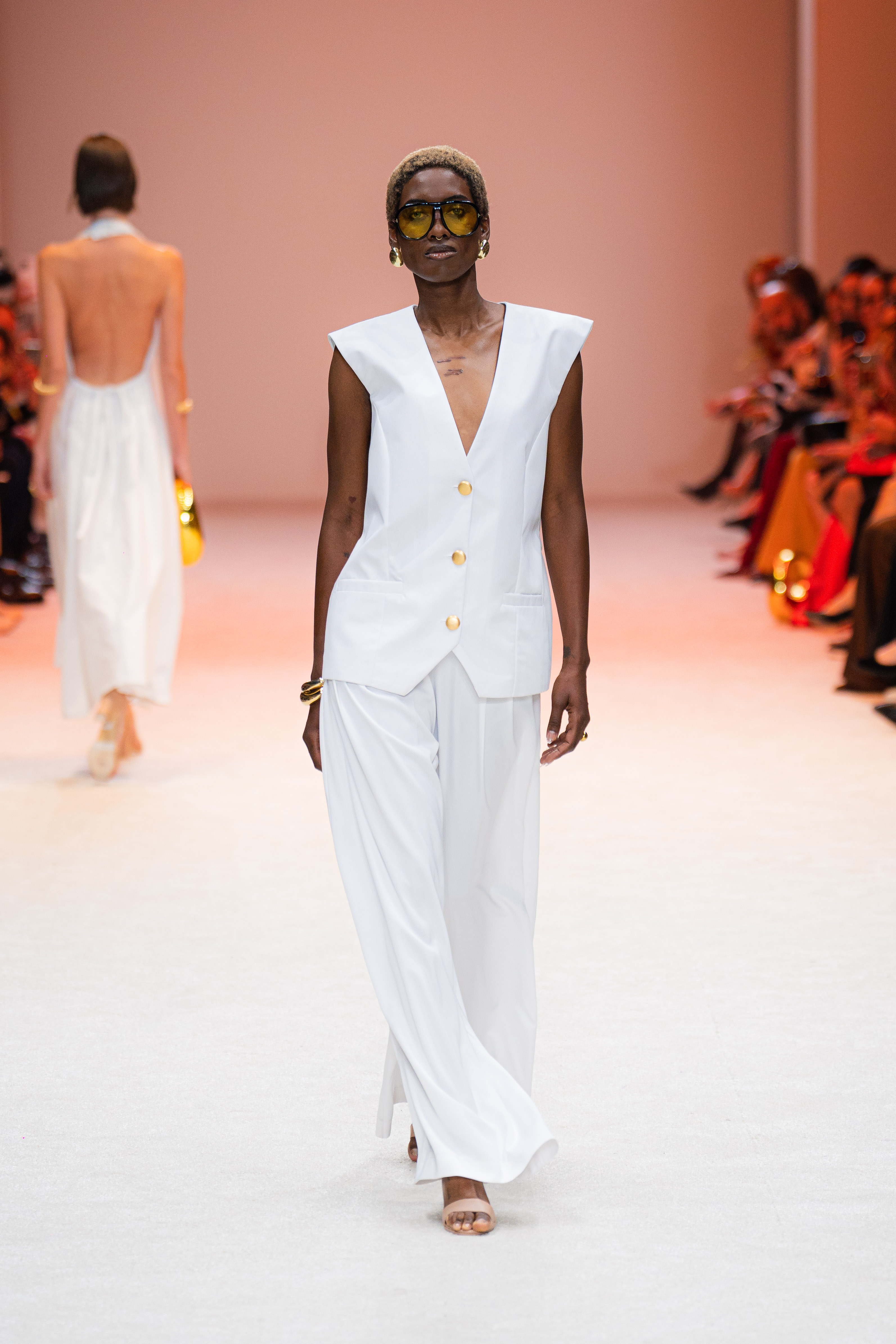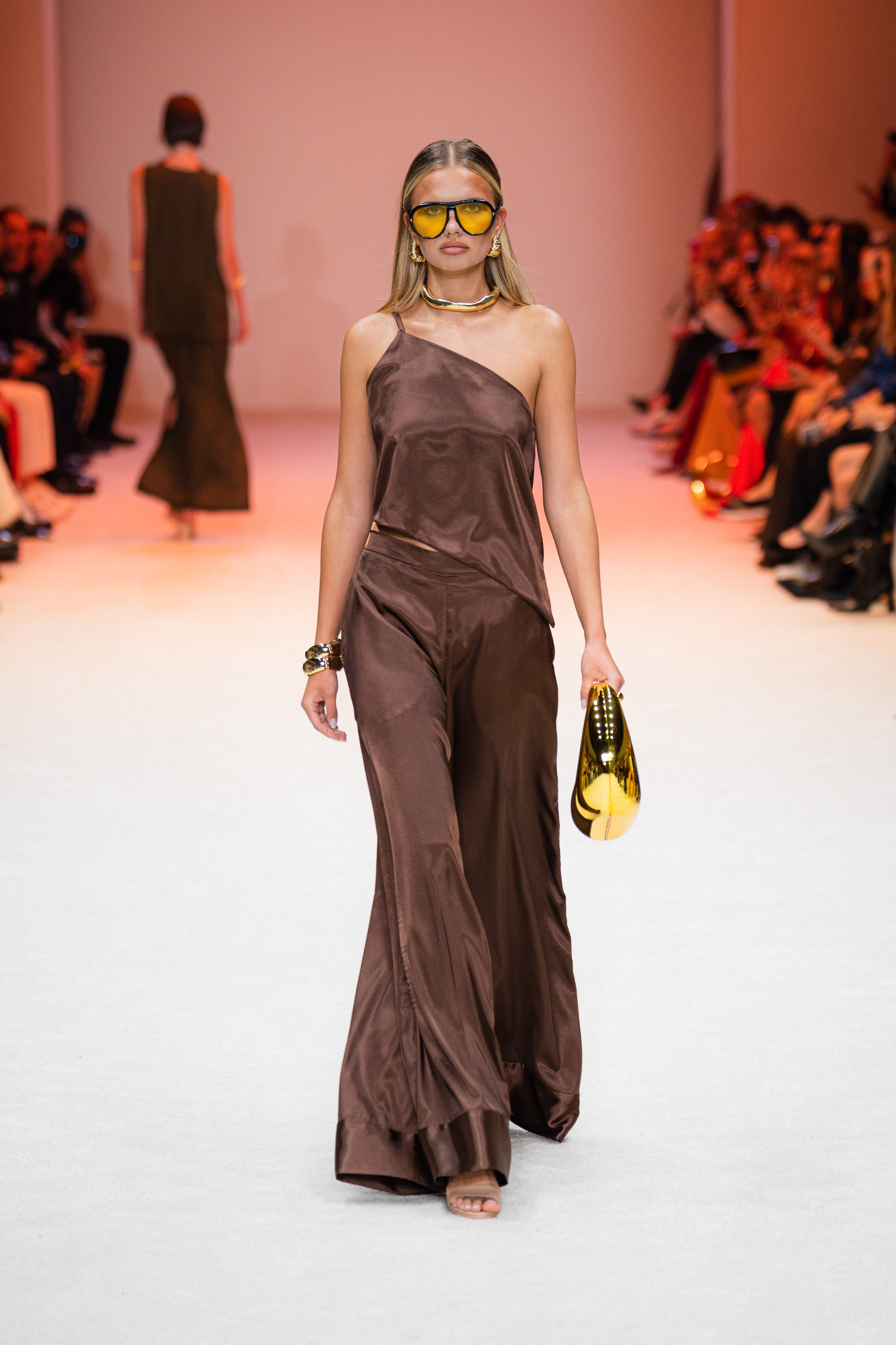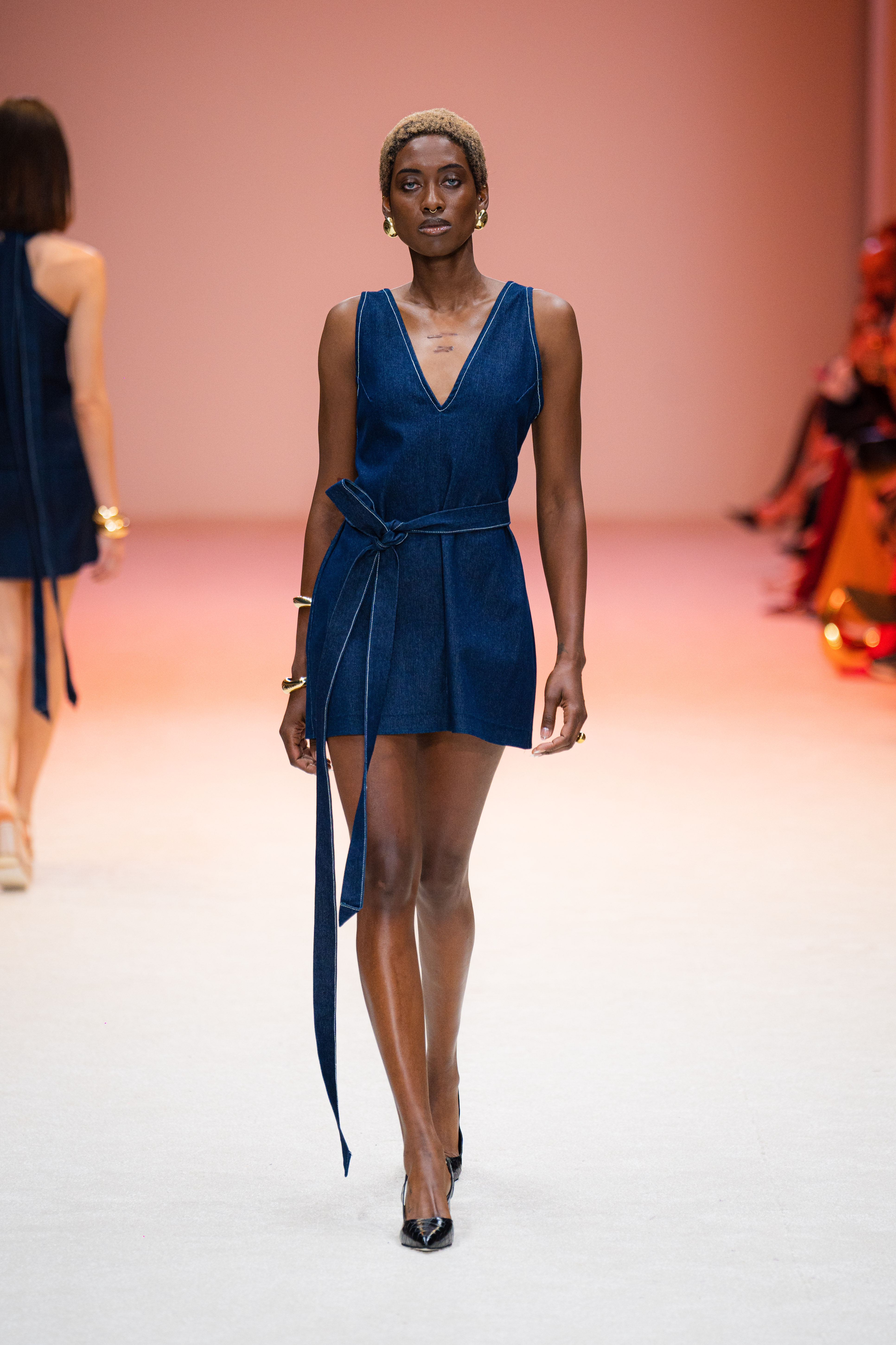 La ambientación de la pasarela fue fundamental para crear la atmósfera adecuada. Desde el inicio, un juego de luces blancas y constantes envolvió el espacio, proporcionando un fondo elegante que resaltó cada uno de los diseños expuestos. La música, de ritmo lento y envolvente, se acopló perfectamente al paso de los modelos, creando una experiencia sensorial que mantuvo a la audiencia en un estado de admiración.